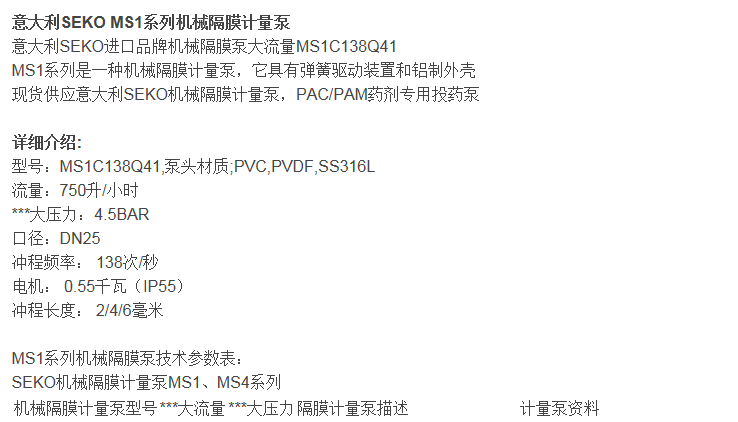 • SEKO賽高M(jìn)S1系列機(jī)械隔膜計(jì)量泵