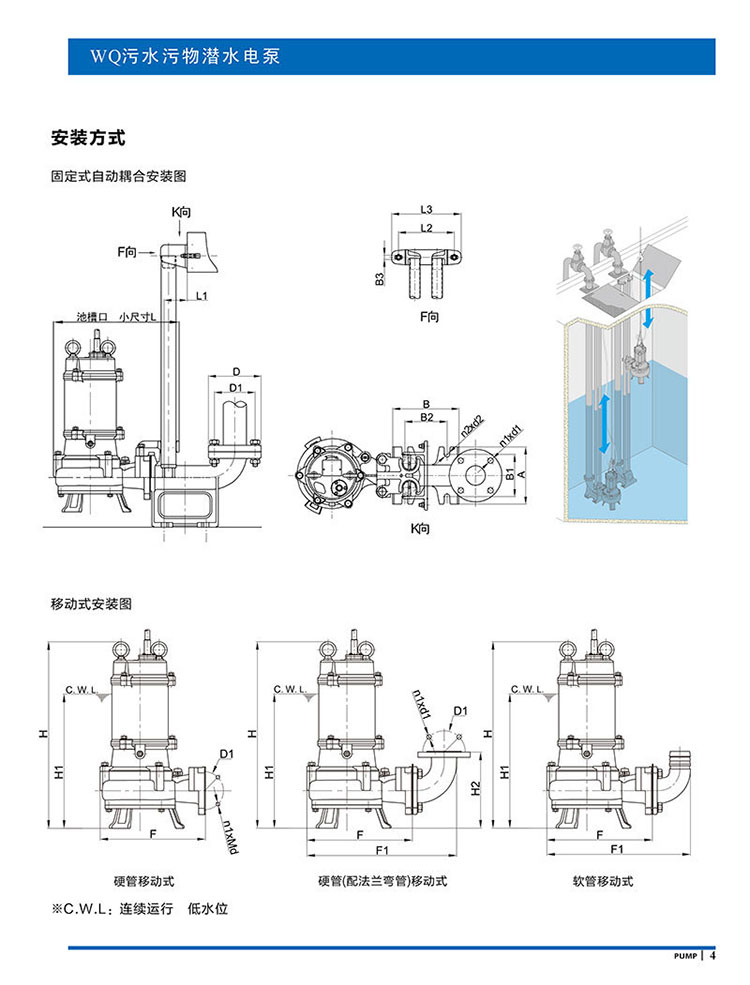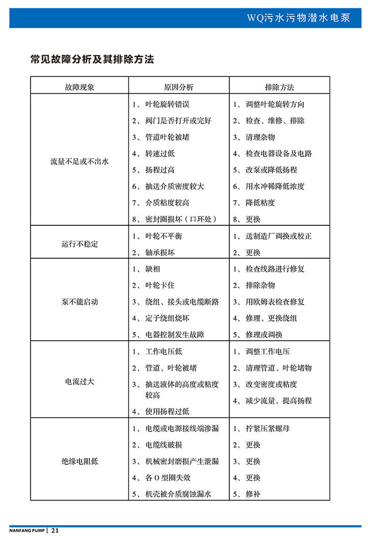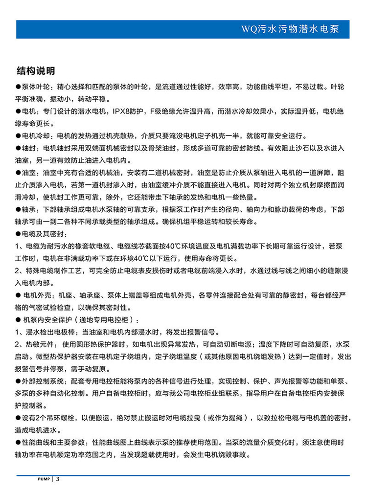 產(chǎn)品說明:南方WQ污水污物潛水電泵由電機(jī)與泵兩部分組成,兩者通過油室及機(jī)械密封組件隔開,分固定式自動(dòng)耦合安裝和移動(dòng)安裝。