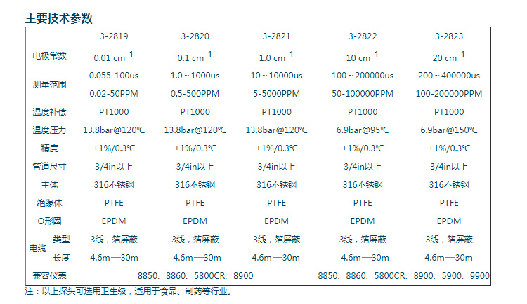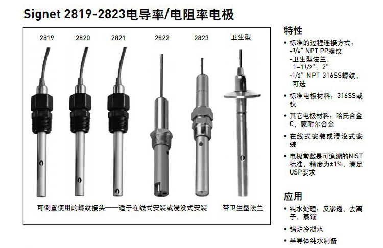 2819-2823電導(dǎo)率/電阻率電極可以采用多種安裝方式,能確保良好的準(zhǔn)確度和重復(fù)性。標(biāo)準(zhǔn)材料為316不銹鋼或鈦,也可選用其他材料??蛇x用衛(wèi)生型法蘭。電極中內(nèi)置PT1000熱電阻,對溫度進(jìn)行測量。