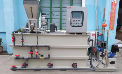溶液箱的有效容積為500~5000L,它分成三個小室為配藥室、熟化室和儲液室,三個小室內(nèi)設(shè)有特制的攪拌機進行溶解攪拌,個室為預(yù)制部分,后兩段進一步進行攪拌,使藥劑與水充分混勻,制成均一濃度的溶液供使用。各室之間有溢流口進行連通,室滿后,流入第二室,依此類推,最后進入儲藥室內(nèi),儲藥室內(nèi)有高中低三個點液位傳感器,高液位為緊急停干粉投料器并停止進水,中液位為啟動干粉投料器與并進水,至低液位時,停計量泵。其中最高位與最低位時,在顯示屏上都會顯示液位狀態(tài),提醒操作人員是否供水故障(水壓不足、中間管道被堵、電磁閥漏水)或計量泵未工作。