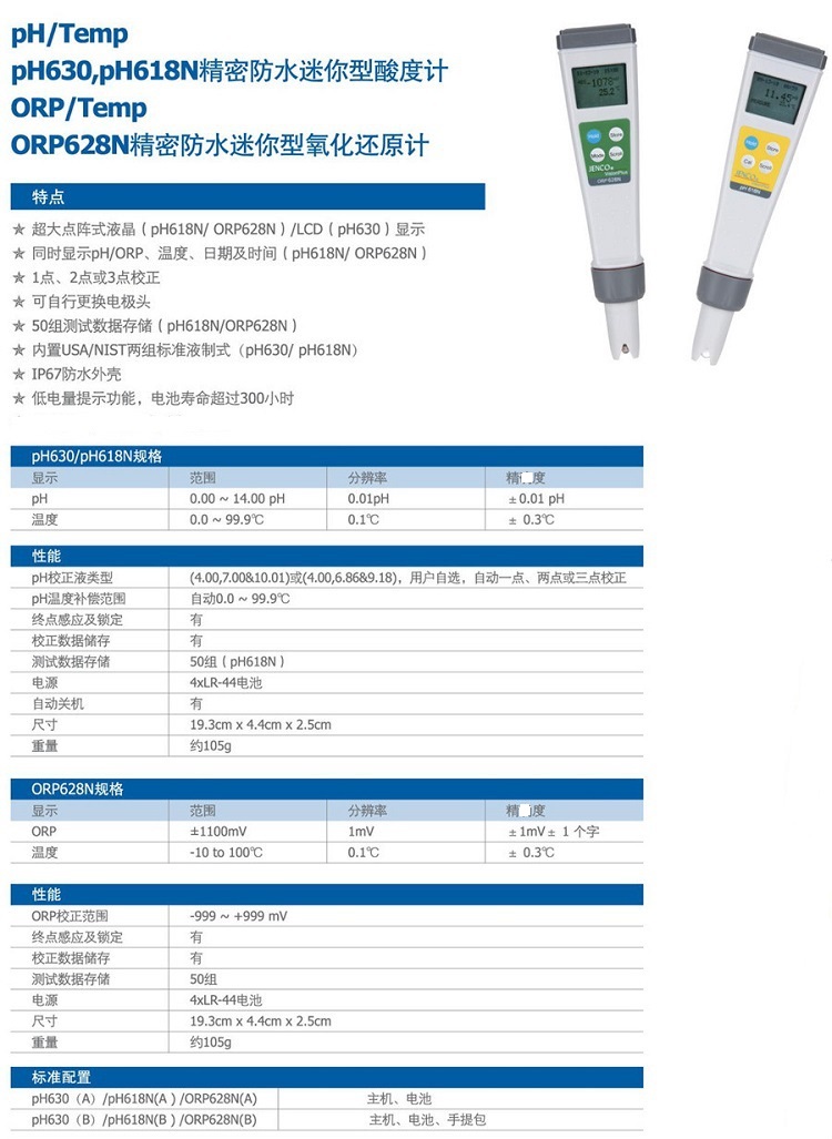 pH618之新一代測試筆產(chǎn)品,IP-67規(guī)格機身,可讀取溫度,高達50筆資料儲存功能,清單式操作方式,具可替換式電極程序??汕袚Q華氏與攝氏溫度單位。