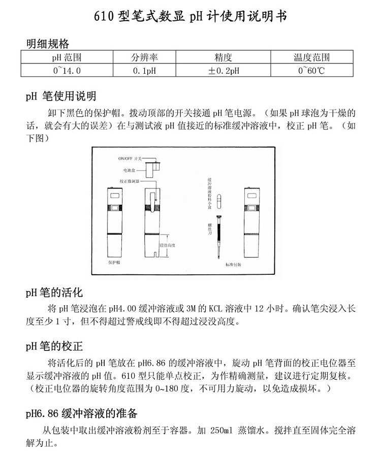 使用簡(jiǎn)易,口袋型pH測(cè)試筆,無(wú)周遭溫度應(yīng)用功能。具單點(diǎn)校正功能,使用電源為1.5 V電池四顆。