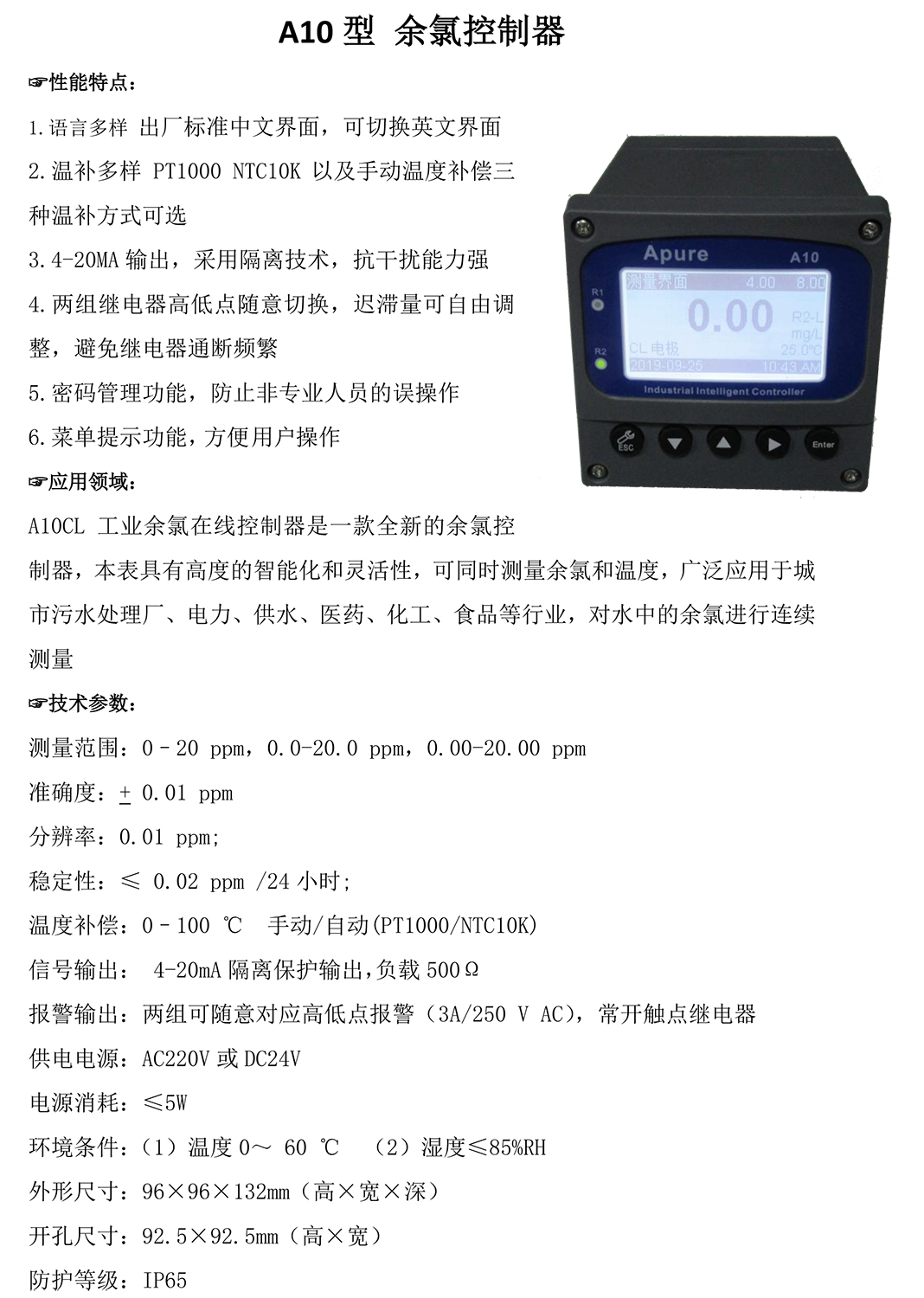 Apure愛普爾A10CL兩組繼電器工業(yè)在線余氯控制器一套含電極
