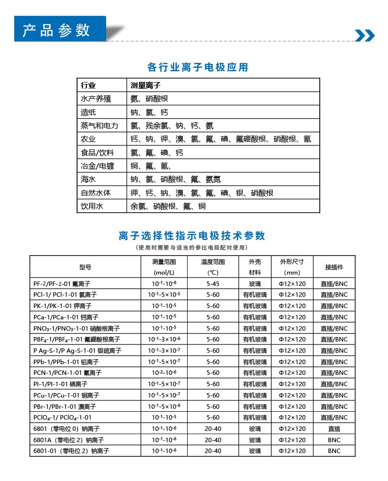 PCN-1-01型氰離子電極 測量范圍:(10-2-10-6)mol/L 敏感膜:鹽膜 外殼材料:有機玻璃 外形尺寸:Φ12×120mm 溫度范圍:5-60℃ 接插件:BNC(Q9型)