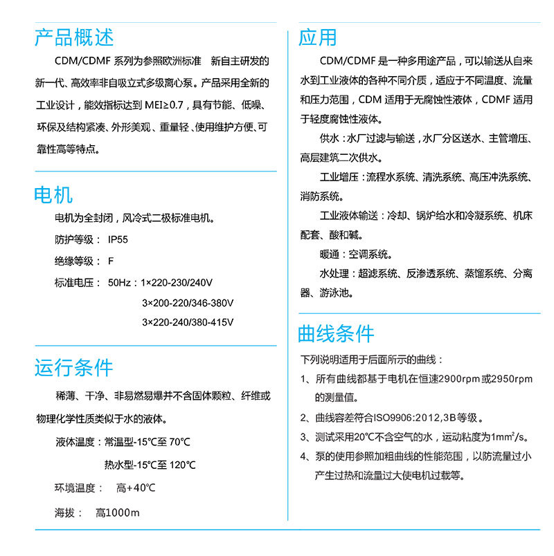 南方CDM/CDMF系列為參照歐洲標(biāo)準(zhǔn)新自主研發(fā)的新一代、高效率非自吸立式多級(jí)離心泵。產(chǎn)品采用全新的工業(yè)設(shè)計(jì),能效指標(biāo)達(dá)到MEI0.7,具有節(jié)能、低噪、環(huán)保及機(jī)構(gòu)緊湊、外觀美觀、重量輕、使用維護(hù)方便、可靠性高等特點(diǎn)。