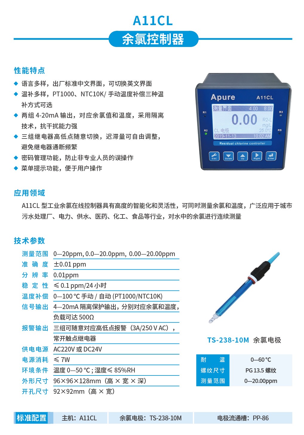 Apure余氯儀A10/A11/A20CL工業(yè)余氯在線控制器數(shù)顯臺式余氯測試儀