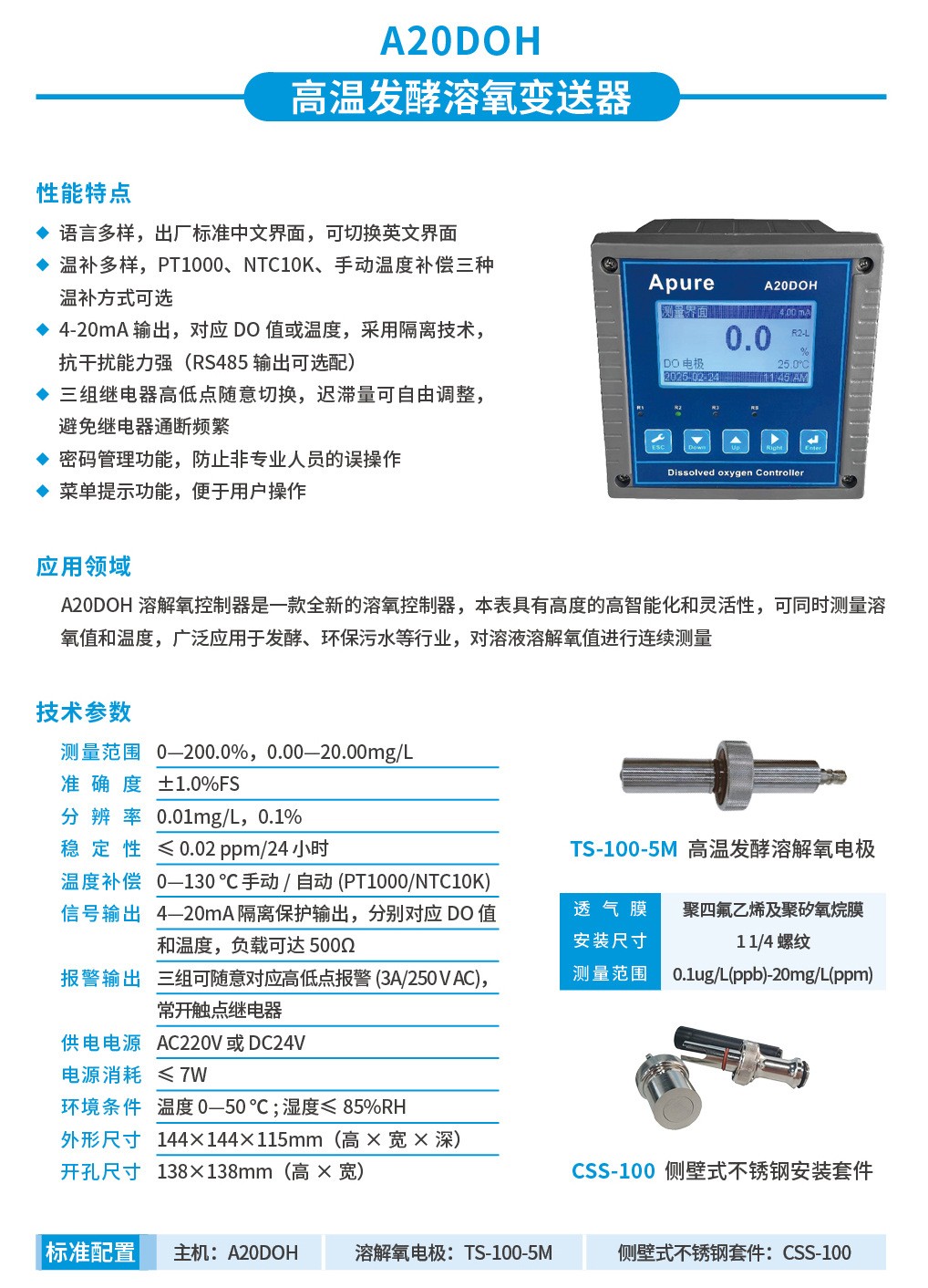 Apure 在線溶氧儀 A20DO 工業(yè)溶氧變送器智能大屏數(shù)顯do溶解氧控制器