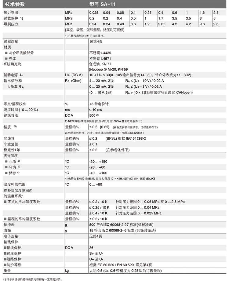 壓力范圍從0...25 kPa0...2.5 MPa,壓力變送器SA-11是由直流DC 10 (14) ...30 V 供電。