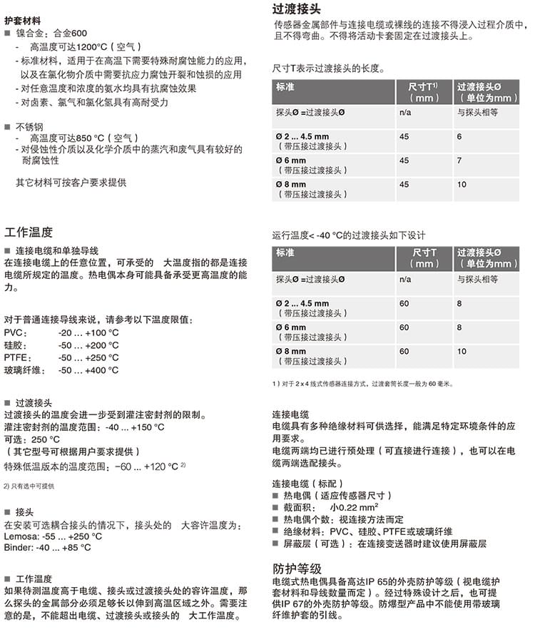 電纜式熱電偶溫度計特別適合需要直接將金屬傳探頭裝配到鉆孔(如在機械部件中)或測量過程的應用(即適用于所有不帶化學侵蝕性介質(zhì)且無磨損的應用)。要將溫度計安裝到護套中,就需要使用一個彈性卡套接頭將探頭壓入護套底部。這樣可以確保施加在探頭的力度不超過臨界值。標準型電纜式熱電偶溫度計不帶過程連接件,不過可使用螺紋接頭、活動螺母等緊固件進行連接。