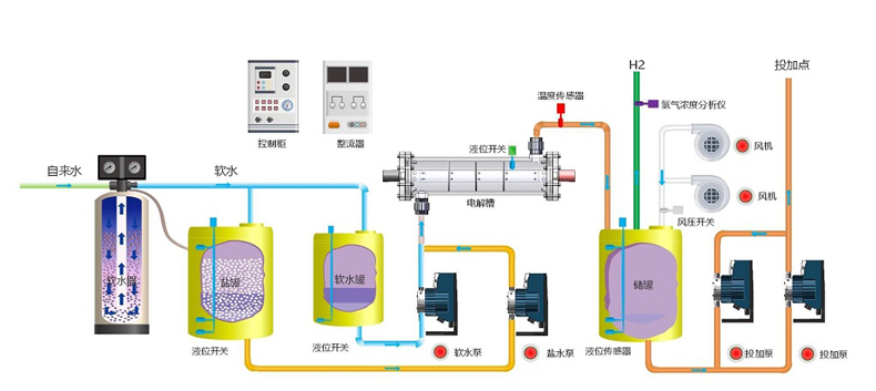 2、由軟化系統(tǒng)、軟水儲(chǔ)存系統(tǒng)、溶鹽系統(tǒng)、鹽水配比系統(tǒng)、供電及控制系統(tǒng)、電解系統(tǒng)、次氯酸鈉儲(chǔ)存系統(tǒng)、投加系統(tǒng)等系統(tǒng)組成;