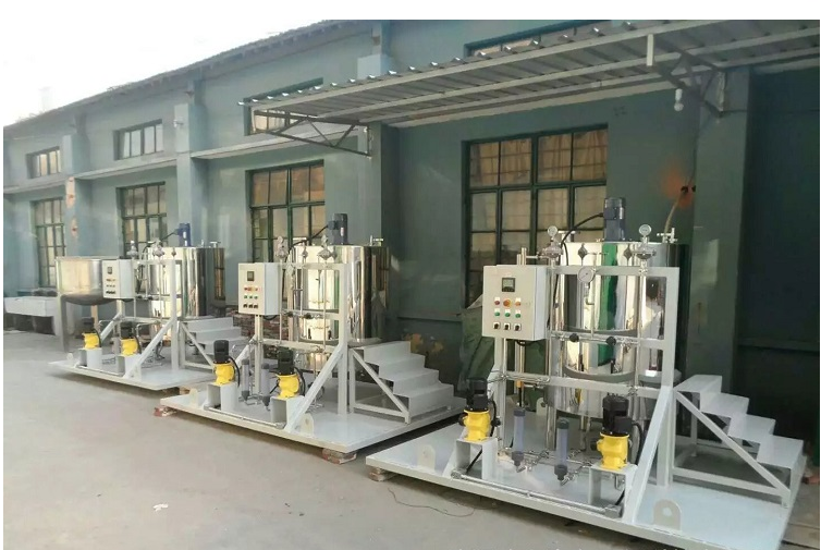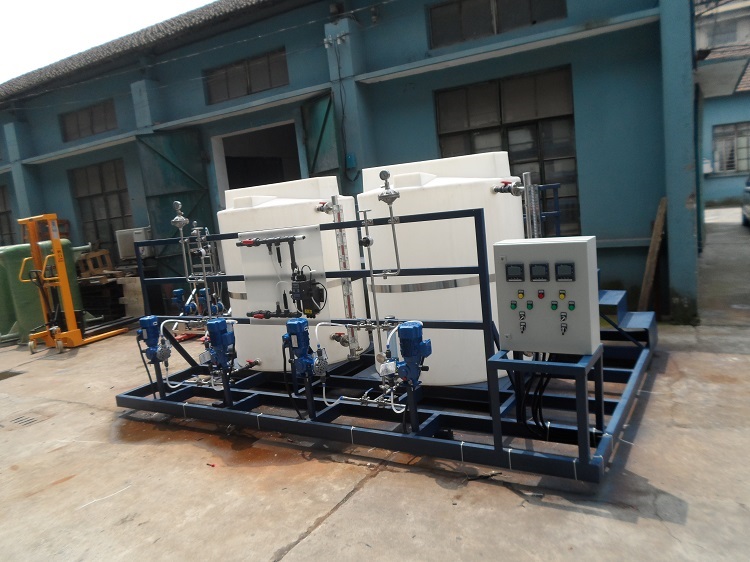 該裝置裝置配帶控制柜,可采用PLC控制或變頻控制。控制柜設(shè)置了低液位停泵、計量泵及攪拌機故障聲光報警等功能。